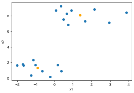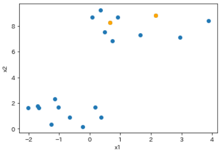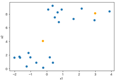 1.全データの中から、分けたいクラスタの数だけ、シードと呼ばれる点をランダムに選ぶ